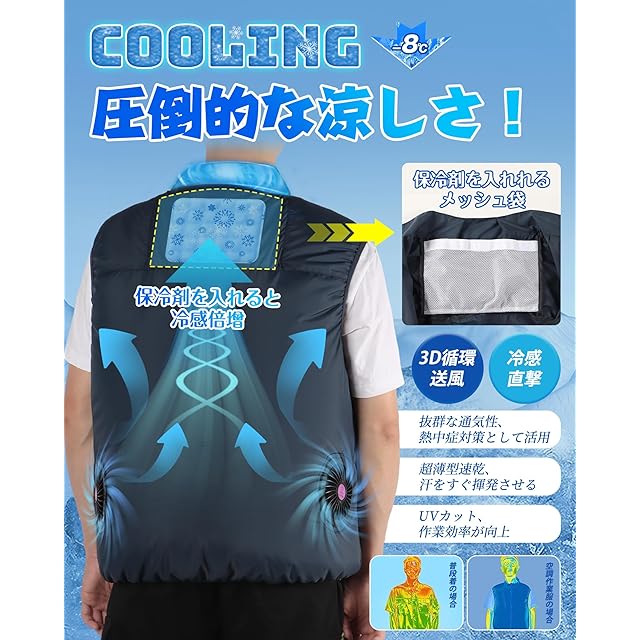 [inotenka] 2025暴風ファン & 体感-8℃ ファン付きベスト 空調作業服 M-6XL 大きいサイズ ファン付き作業服 大風量 3D循環送風 扇風機付きベスト 作業ベスト 3段階風量調節 超軽量 通気 UVカット 撥水加工 男女兼用 熱中症対策(6XL ブルー)
