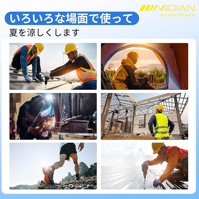【ファン付きベスト】MIDIAN2024年夏の最新ファン作業着、吸湿性・耐久性・耐摩耗性に優れたポリエステル100%素材を採用し、作業服のポテンシャルを最大限に発揮します。 MIDIANオリジナルの背面開放式3D立体風道設計(特許設計)を採用して、空気循環効率を30%以上向上させ、同時に頭部に風を送り、温度を下げます。 360度涼しく感じられます! 高温環境で長時間作業する場合でも、熱中症のリスクを低減することができます! 高温環境下でも、楽に仕事ができ、作業効率を向上させることができます! 猛暑への熱中症対策!