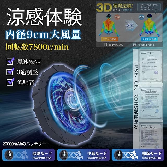 ✅【ファン付きベスト&ファンセット】最新型の品質と安全性が高い5Vファン。5500r/minの回転速度、使用環境により、最大限は7000r/minを達せるパワフルなモーターを採用して、空気力学の原理に基づいて、9枚の大面積羽根が均一に気流を割で、低騒音で風量UP!涼風を作ってくれます。風量が3段階と切り替えます。上質な高密度ABS素材、良質の純銅芯モーターを採用し、最新圧倒的な省エネ性能を実現しています。同類製品に比べると、電源が切れそう時、1Aの電力でも送風できます。USB型ファン:USB給電なので、専用バッテリーだけでなく、モバイルバッテリーも使用可能です。夏の幅広い現場作業において、疲労軽減、作業効率の向上、熱中症対策にも効果あります。