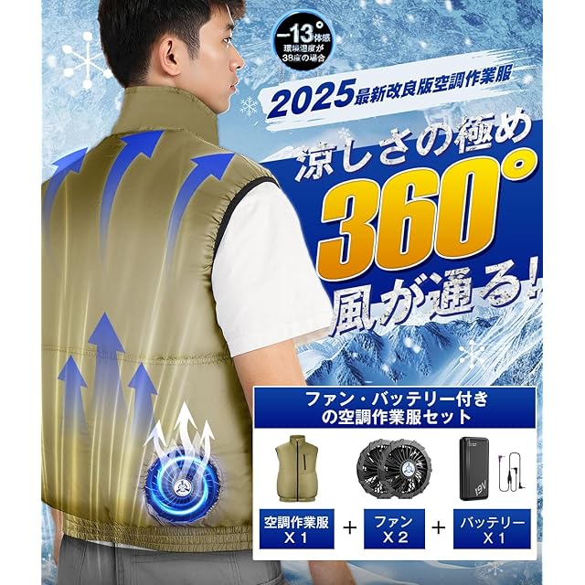 [Sumeriy] 空調作業服 ベスト 30000mAh大容量バッテリー付属 超高出力 ファン付き作業服 ファンバッテリーセット 薄型 超軽量 4段階調節 日本製高性能モーター 9枚ファン 強力風量 UVカット USB給電式 暑さ対策 熱中症対策 吸汗速乾 工事現場 アウトドア スポーツ 運動 登山対応 (2XL, カーキ)