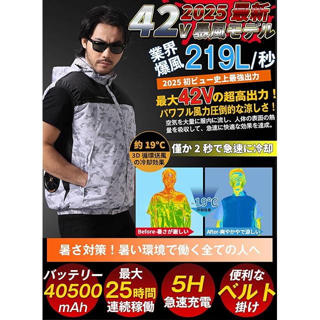 【2025猛暑究極の42V超高電圧出力&40500mAhバッテリー&25時間連続稼働】夏の作業服専用に設計した業界トップクラスの42V超高電圧出力バッテリーが登場!当社が夏を満喫するための究極のウェア対応策を探しました!最強は驚いた219リットル/秒の爆風効果に達成、スーパー総合効果は、従来のより45%の風量強化、市販されている他のファンベストよりも、温度低下と発汗効果が40%以上高い同時に、強力した風を提供できます。さらに、40500mAhの超大容量、最大25時間の超驚異的な稼働時間を実現しました。炎天下の長時間労働者で涼しい服をお探しの方にびったりです。付属の一体式急速充電器で、約5時間フル充電になります。バッテリーは、余分なスペースを取らず、体から解放されます!