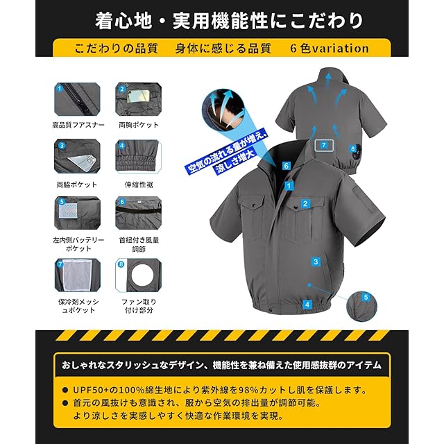 【ファン付き作業服】一番人気なファン付き作業服は今年真夏に初めて登場します。夏の猛暑時期に炎天下の現場でも楽しく作業できるファン付き作業服! ウェア、バッテリー、ファン、ACアダプターがすべて揃った作業服セット、シンプルな着用を行うだけで、体をすぐ楽々に!内部全面に高密度綿加工素材によって、紫外線を防ぐUVカット素材を使用、紫外線によるダメージの99%を防ぎ、暑さの根源を徹底的に遮断、圧倒的な涼しさを実現!通常素材作業服より平均15℃温度を下げる効果を実現しました。新型のデザインにより、首元までしっかりと風が通り、服の中を通った暖かく湿った空気は袖ロと襟元から排出、ファン付き作業服の性能を最大限発揮できます。