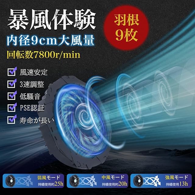 【高品質で長寿命のファン】:風速は3段階調整可能で、PSE認証を取得しており、安全性が高く、使用寿命が長い(連続使用時間は10,000時間以上)。9枚の羽根を備えたファンで、風力が強く、風速が安定して低ノイズで、清掃もしやすい。ファンは軽量でコンパクトなため、身に着けても全く重量感を感じません 。
