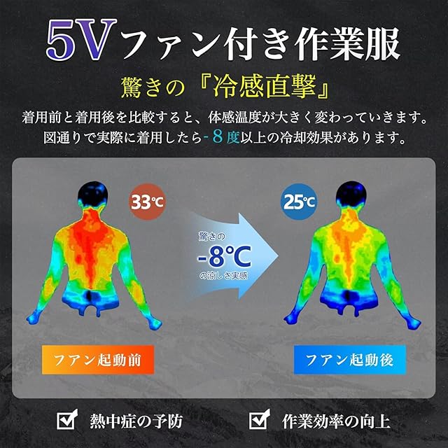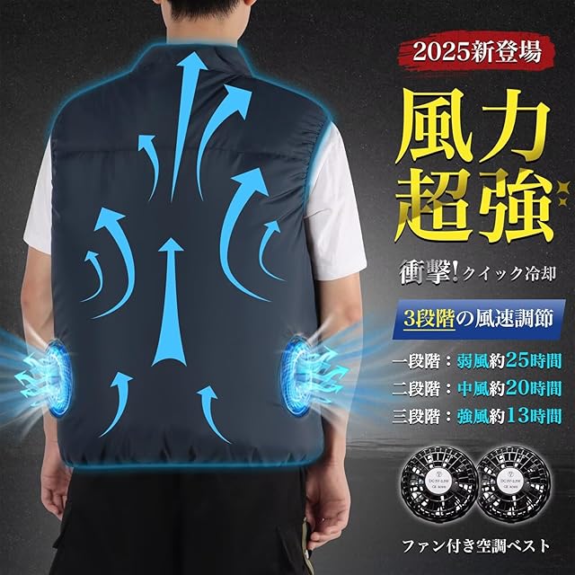【ァン付きベストセット】空調ウェアセット内容:作業服*1、フアン*2、接続ケーブル*1。2025 年 全く新しく改良された空調作業服。ファンの取付位置を改良、腰を圧迫なし、ファンにも良しファンを左右にずらすデザインにより立っていても座っていても、着用者は腰が圧迫されずに快適に過ごせます