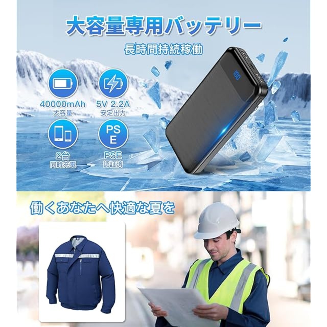 【大容量バッテリー付き&長時間稼働】40000mAh大容量バッテリーが付いており、風量モードにより使用時間は約12-20時間になり、長時間稼働することが実現できます。また、USB給電なので、専用バッテリーだけでなく、モバイルバッテリーも使用可能です。なお、モバイルバッテリーには5V/2.2A安定な出力を持ち、空調作業服用だけでなく、スマホなどの電子製品への充電にも適用します。更に、PSE認証を取得済で、心置きなくご利用頂けます。