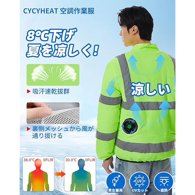 [CYCYHEAT] 空調作業服 長袖 服のみ 9cm穴 洗い替えに便利 互換性 長袖 高視認 作業着 冷却ウェア 釣り ゴルフ 夏用 男女兼用 吸汗 速乾 単品 (JP, アルファベット, 2XL, グリーン 反射長袖)