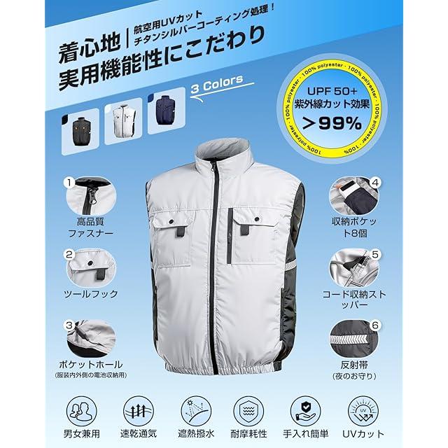 【風路改良設計&-15℃体感温度冷却&UPF50+】最先端の熱力学と流体力学技術を駆使して設計されたこの空調作業服は、背中2ファンと改良風路通リ道は首上半身の送風不足問題解決!両脇の2ファンは体正面と脇の下の送風不足問題解決!4ファン360℃全方位循環送風、体の熱を効率的に分散させ、体感温度を15℃下げ、高温作業でも涼しさを保ちます。その以外、チタンコーティング処理をして、UPF50+、有害な紫外線が99%カットしだけでなく、日差しによる服温度の急上昇を防ぎ、ファン付きベストの性能を最大限に発揮します。