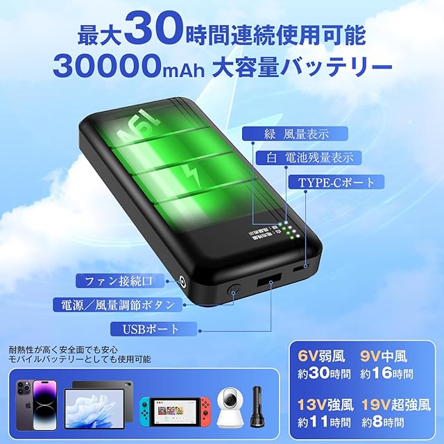 【30000mAh超大容量バッテリー】長袖空調作業服は30000mAhの大容量バッテリーが付属し、暑い環境でも長時間使用可能。最大出力電圧19Vで、圧倒的な風量を生み出し、瞬時に体温を下げ、極上の涼しさを実現します。風量モードにより使用時間は約8-30時間になります。また、PSE認証を取得していますので、安心してお使いいただけます。