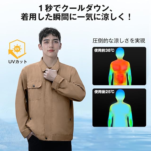 【おすすめできる6つの理由】1.空調作業服はUVカット素材を使用しており、紫外線から肌をしっかりと守ります。2.ゴム裾設計を取り入れ、密封性がアップした上、バッテリーの重量を分担させます。3.ファン取り付け部には強化リングがついており、より簡単に取付可能。4.肩部分に調節ゴムが設計され、服の肩幅を調整可能。5.背後部にアイスポケットを完備。6.作業中にケーブル脱落を防止するケーブルホルダーを装備。