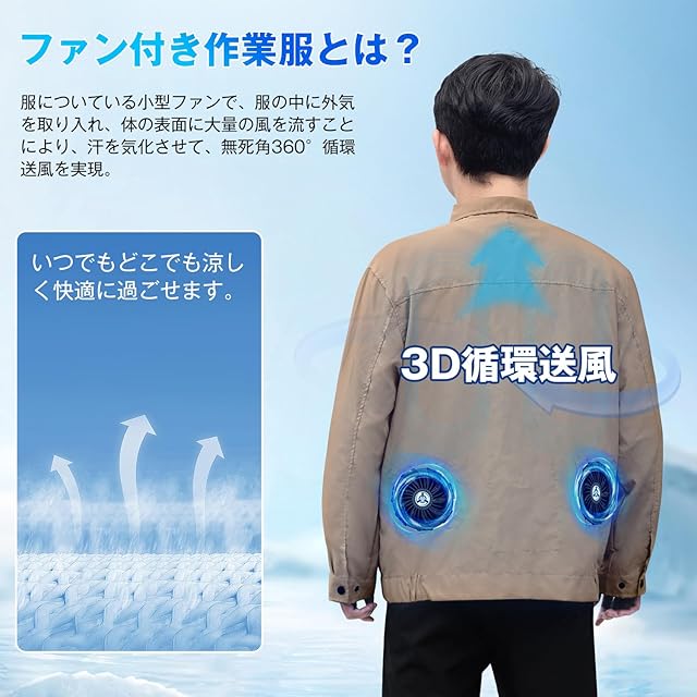 [Sumeriy] 空調作業服 長袖 30000mAhバッテリ付き ファン付き作業服 3D循環送風 4段階風量調節可 USB給電式 超長連続使用時間 9枚ファン 大風量 静音 UVカット 暑さ対策 熱中症予防 屋外作業 在宅 通勤 男女兼用 (XL, カーキ)