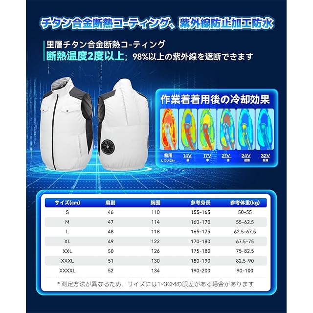 【最強空調作業服】2025夏の最新作、32V作業服登場!厳選した(100%ポリエステル)生地で。細い単糸纎度の糸を使用した高密度織物に撥水技術をドッキングした着心地が快適な撥水・防風・透湿素材です。生地と肌の間に刺激がなく、湿疹などの心配がありません。作業服に取り付けられた32V暴風ファンは、新鮮で大量の空気の流れをつくり、作業中かいた汗を瞬時に蒸発させることができます。首部エアダクト構造、首元までしっかりと風が通り、服の中を通った暖かく湿った空気は袖ロと襟元から排出、(ファン付きベスト)の性能を最大限発揮できます。