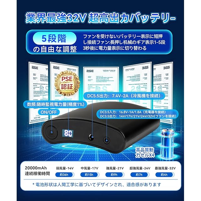 【32V高出力バッテリー】急速充電対応、急速出力対応の2025年最新モデル、32V高出力パワーバッテリー登場!バッテリとファンはDCヘッドを使用して接続され。LED液晶ディスプレイを搭載し、バッテリー残量と出力電圧をリアルタイムかつ正確に表示します。電池が切れるまで安定した風を提供できる。従来のフアン電池残量がなくなると、風が弱くなり、風力調整をしても効かない。シンプルで直観的な操作性です。PSE認証を取得したバッテリー品質と安全性が高い、人体に危害がありません。長期間安心してお使いいただけます。
