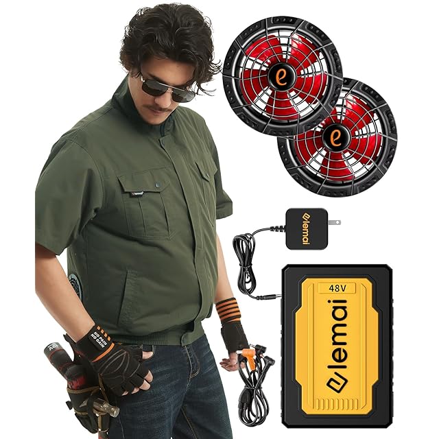[elemai] NEWモデル ファン付き作業服 遮熱-15℃ 48V超高出力 ファンバッテリーセット 2種類モード搭載 空冷調節作業服 綿100%(L, アーミーグリーン半袖)