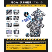 【ファン付き作業服】一番人気なファン付き作業服は今年真夏に初めて登場します。夏の猛暑時期に炎天下の現場でも楽しく作業できるファン付き作業服! ウェア、バッテリー、ファン、ACアダプターがすべて揃った作業服セット、シンプルな着用を行うだけで、体をすぐ楽々に!生地裏に高密度コットンプロードを施すことによって、紫外線を防ぐUVカット素材を使用、紫外線によるダメージの99%を防ぎ、暑さの根源を徹底的に遮断、圧倒的な涼しさを実現!通常素材作業服より平均15℃温度を下げる効果を実現しました。新型のデザインにより、首元までしっかりと風が通り、服の中を通った暖かく湿った空気は袖ロと襟元から排出、ファン付き作業服の性能を最大限発揮できます。保冷剤パック用のポケットを全仕様で標準装備!利用して更に体を冷やすことができます。作業中の体温上昇を抑える効果があります。