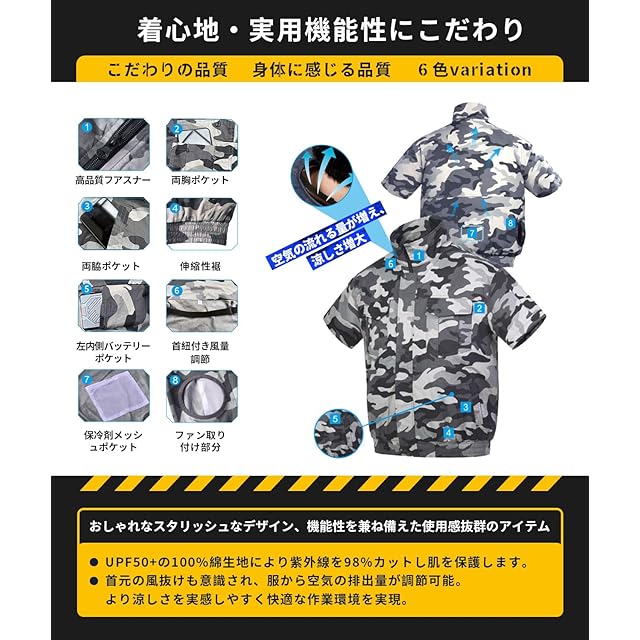 [elemai] NEWモデル ファン付き作業服 遮熱-15℃ 48V超高出力 ファンバッテリーセット 2種類モード搭載 空冷調節作業服 綿100%(3XL, カモフラージュ半袖)