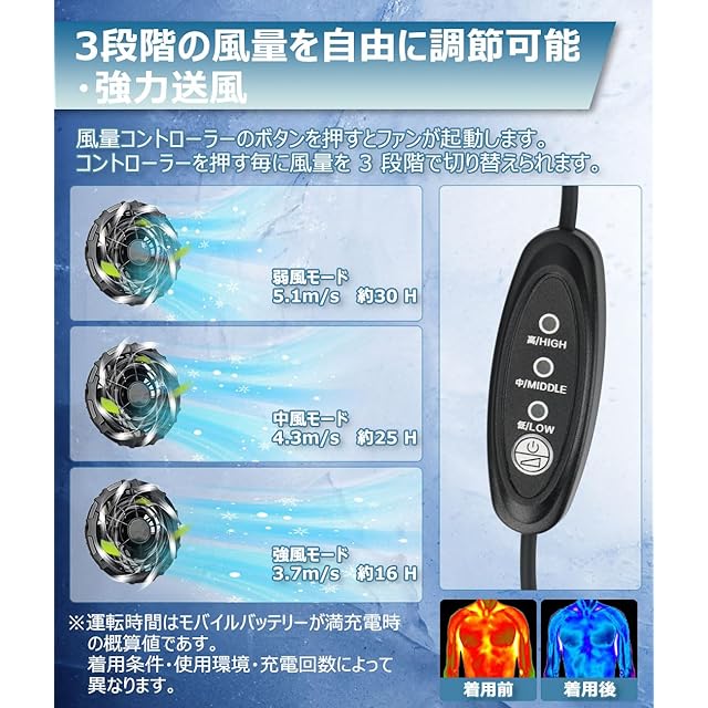 【驚異の爆風&3段階風量調節】上質な高密度ABS素材、高性能全銅芯ブラシレスモーターを採用し、圧倒的な省エネ性能を実現しています、回転音が気にならない静音設計です。空調ウェアの付属のファンは最多の3枚羽タイプを使用。風力がパワフルなのに静音でストレスフリーの心地良い風を生み出します。スイッチを入れると瞬時に空調ウェアが膨張し、腹部から背中まで一瞬のうちに風が巡り、首元まで風が巡って気持ちいい! 夏の猛暑を忘れてしまうほどの快適な涼しさを得られます。高出力リチウムオンバッテリーと組み合わせることによって、「強風ー中風ー弱風」3段階の風力が調節でき、炎天下での作業時に体感温度を最適化にすることで、実用性と便利性を兼ね備えたアイテムです。