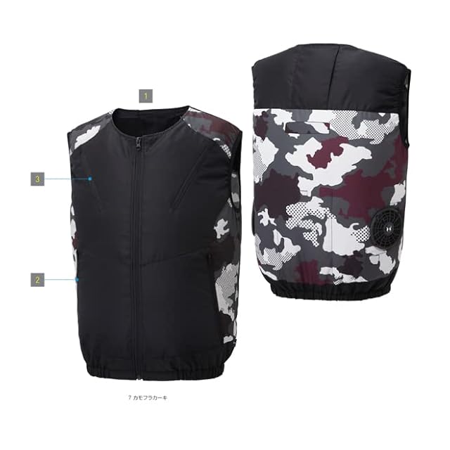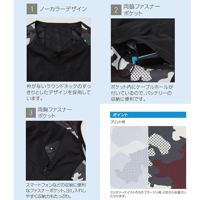 ・2023年新商品。すっきりとした印象のノーカラーベストが新登場。アウトドアにも最適なカモフラデザイン。(KF92362)・UVカット素材。ソフトな風合いとマットで上品な発色が特長。/風気路・ノーカラーデザイン/両脇ファスナーポケット/両胸ファスナーポケット/ファン取り付け部・服のみの販売です。ファン,バッテリーは別売りです。・オリジナルステッカー付
