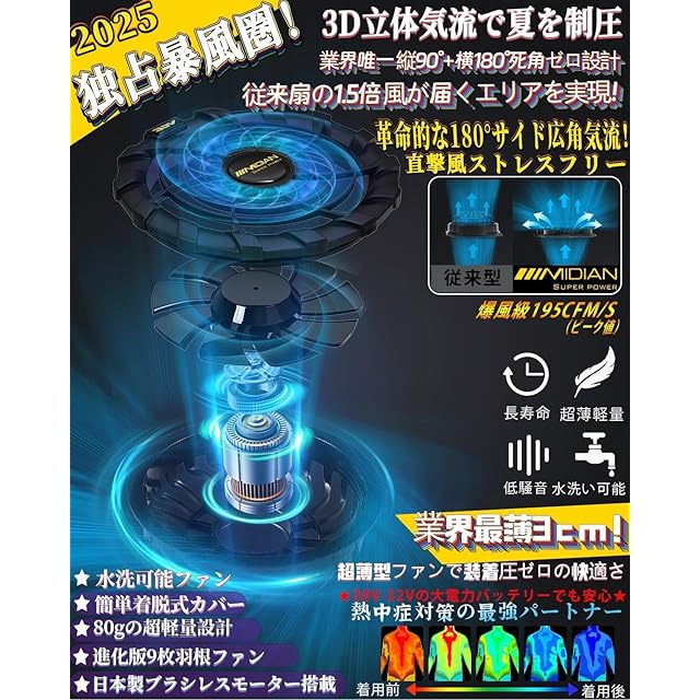 【MIDIAN洗濯&保証対応】空調作業着は洗濯機で洗うことができます。衣服を洗う前に、バッテリー、扇風機、電源コードを取り外してください。水に浸けないでください。本製品には日本語の取扱説明書が付属しており、1年間の品質保証、24時間の技術サポートが提供されています。何か疑問があれば、いつでもお問い合わせください。可能な限りすべての解決策を提供するため、最大限の努力を尽くします。***PL保険加入済***