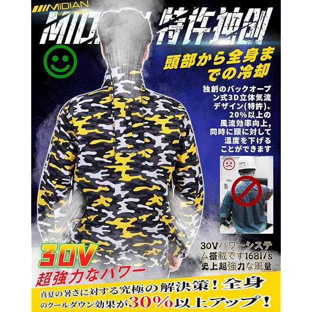 [MIDIAN] 【30V超強力ファン付き作業着】フルハーネス対応作業着20000mAh大容量ファンバッテリーセットフルハーネス安全帯対応日本製無刷モーター uvコーティング UPF50+ 熱中症対策高所作業着長袖(黄迷彩 LL)
