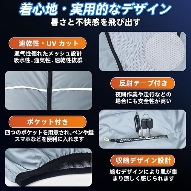 誇り高い革新的なアイスパックデザイン:暑い夏に対応するため、風が氷を通過することで、元の30度以上から10度以下に冷却されるアイスパック構造を革新的に設計しました。その冷却効果は通常の空調作業服の10倍以上で、真の涼しさを実感できます。これは私たちが誇りに思う革新の一つです。