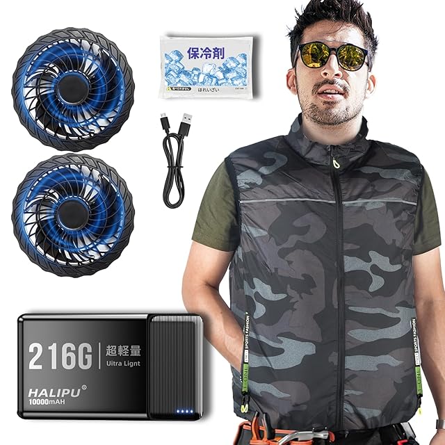 [HALIPU] 【最軽量・保冷剤付き・瞬冷-8℃】 空調作業服 空冷ウェア 冷却ベスト ファン付き作業着 登山 釣り アウトドア 夏用作業服10000mAh大容量モバイルバッテリー付き 3段階風量調節 洗える 速乾 熱中症対策 屋外作業 アウトドア 男女兼用