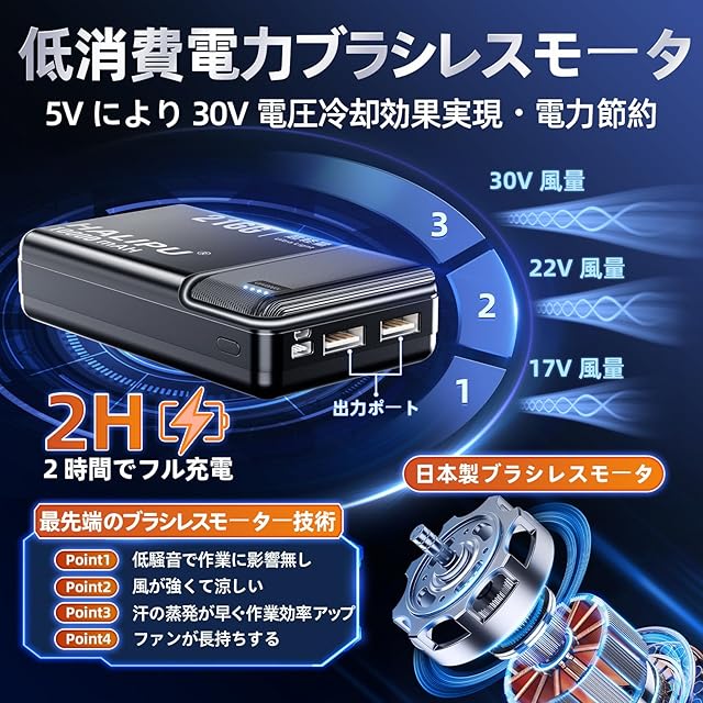 高効率ブラシレスモーター:日本製の最高回転数のブラシレスモーターを搭載。5Vの電圧でも他社の30Vの電圧と同じ風速を提供し、30%以上の電力を節約します。持続的な冷却を確保し、より強力な風をもたらします。