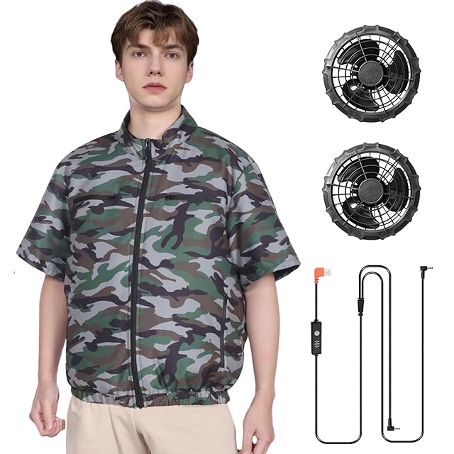[Joyesplay] 空調作業服 ファン付き作業着 空調服 半袖 空調冷却服 最新 ファン付きウェア 空調作業服 3段階風量調節 大風量 暴風ファン 循環送風 熱中症防止 通気 速乾 夏 暑さ対策 男女兼用 (JP, アルファベット, 2XL, カモフラージ)