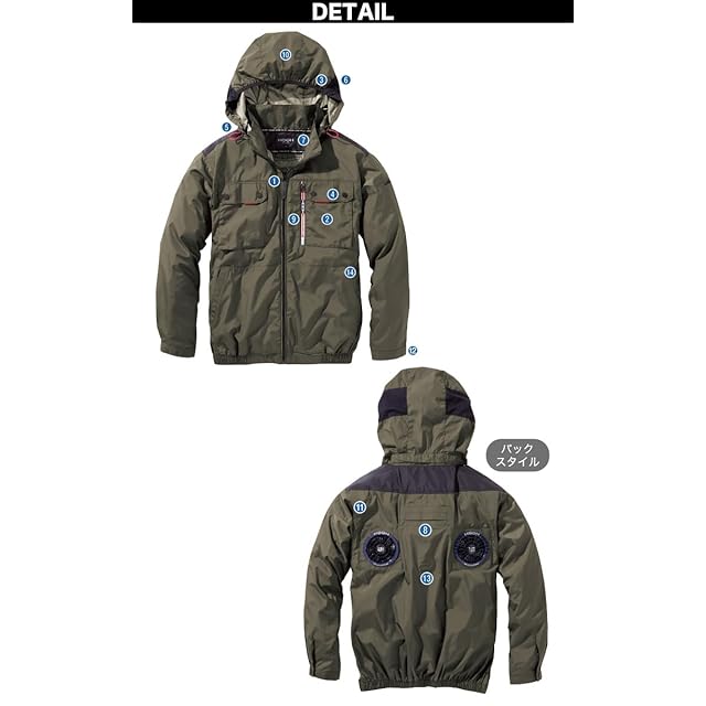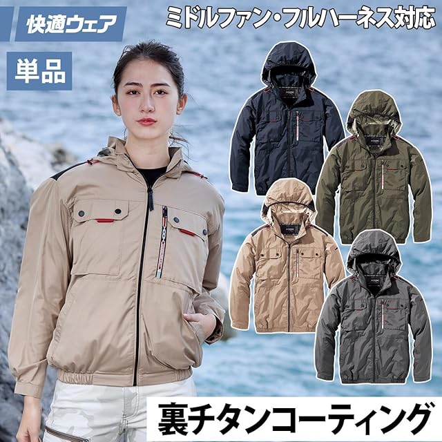 ■機能 フルハーネス対応 ミドルファン 撥水加工 UVカット 消臭テープ 裏チタンコーティング ロゴ入りフロントファスナー 左胸二重ポケット フードストレッチパイピン 2丁掛け対応フック掛け フードゴムスピンドルストッパー 耳部分面冷感コンプレッション 首元ダクト ランヤード取り出し口 左胸プリントファスナー フード取り外し可能 カフス釦 ケーブル止め(ドットボタンタイプ) 袖ペン差し 左右胸ポケットコード通し穴 ファスナー付きバッテリーポケット