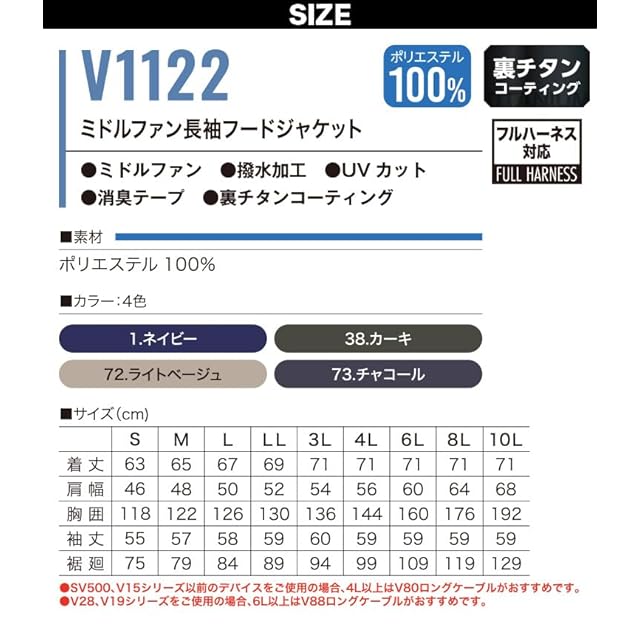村上被服 ミドルファン長袖フードジャケット(単品) V1122 <br />※ファンバッテリー別売り<br />※うきしろちゃんこはぜストラップ付き<br /><br />通常ファン位置より高いミドルファン(ハイバック・上部ファン)位置にファンを<br />取り付けることで、背中から体全体に風が吹き抜け、より強い風が首元から抜けます。<br /><br />※SV500またはV15シリーズ以前のデバイスを使用する場合:<br />4L以上はロングケーブルV80推奨<br />※V28シリーズまたはV19シリーズを使用する場合:6L以上はロングケーブルV88推奨<br /><br />■素材<br />ポリエステル 100%<br /><br />■機能<br />フルハーネス対応 ミドルファン<br />撥水加工 UVカット<br />消臭テープ 裏チタンコーティング<br />ロゴ入りフロントファスナー<br />左胸二重ポケット フードストレッチパイピン<br />2丁掛け対応フック掛け<br />フードゴムスピンドルストッパー<br />耳部分面冷感コンプレッション<br />首元ダクト ランヤード取り出し口<br />左胸プリントファスナー フード取り外し可能<br />カフス釦 ケーブル止め(ドットボタンタイプ)<br />袖ペン差し 左右胸ポケットコード通し穴<br />ファスナー付きバッテリーポケット