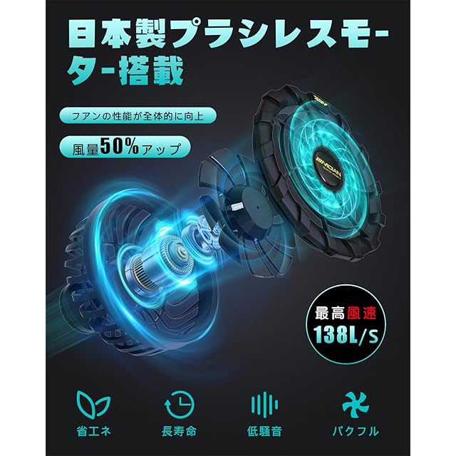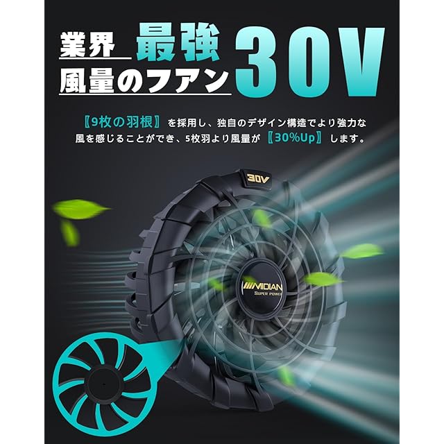 【風力強化&3段階風量調節】5段階の風量モード(9V/15V/17V/19V/30V)、使用時間は約5-30時間です。空気力学の原理に基づき、9枚の羽根が均等に風を切り裂き、低騒音で風量が向上します!快適な風をお届けします。高品質な高密度ABS素材を採用し、高品質の純銅芯モーターを搭載し、最新の省エネ性能を実現しています。さまざまな夏の作業場面で、疲労を軽減し、作業効率を向上させるだけでなく、熱中症の予防にも有効です。