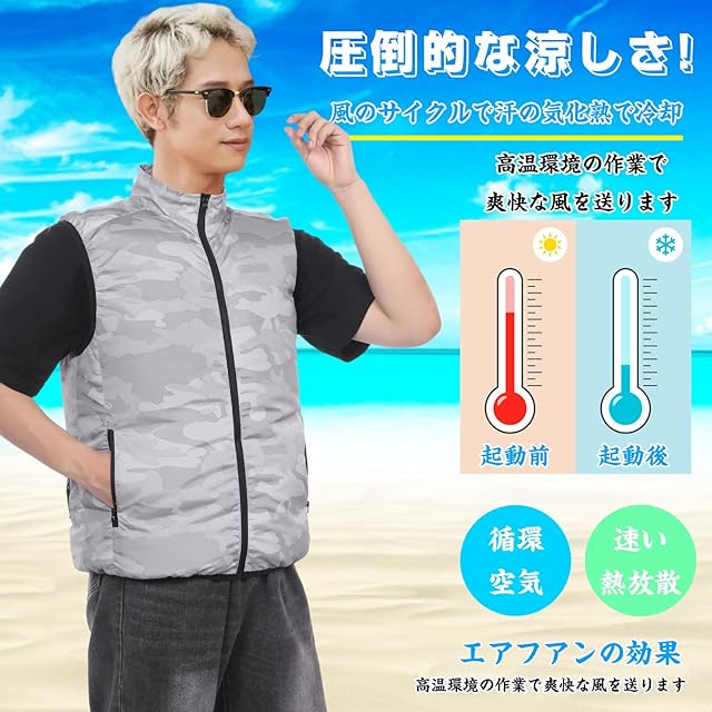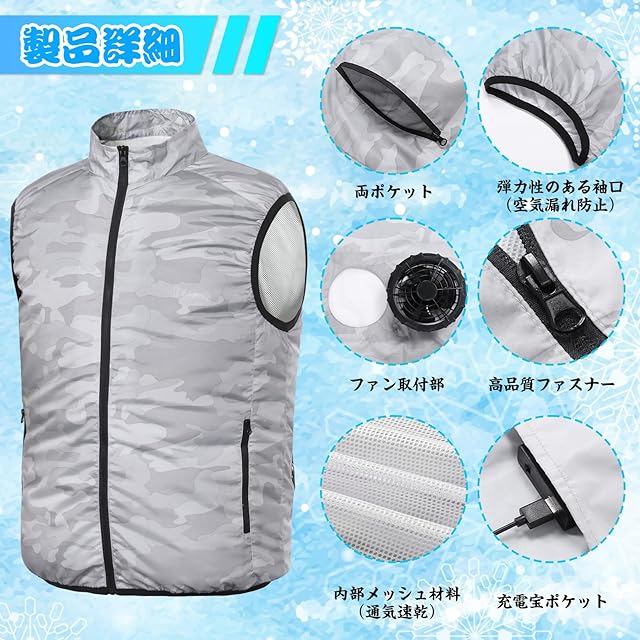 【簡単お手入れ&耐久性のある、便利な設計&迷彩デザイン 】 洗濯機で簡単に洗えるため、清潔さを保ちやすく、繰り返し使用できます。ファン部分は耐久性のある素材で作られており、長時間使用しても故障しにくい設計です。外側には左右に2つのポケットがあり、内側には左右に2つのポケットがあり、内側の背中には2つのメッシュ(マジックテープ付き)ポケットがあります。迷彩パターンは汚れが目立ちにくく、野外での使用に最適です。