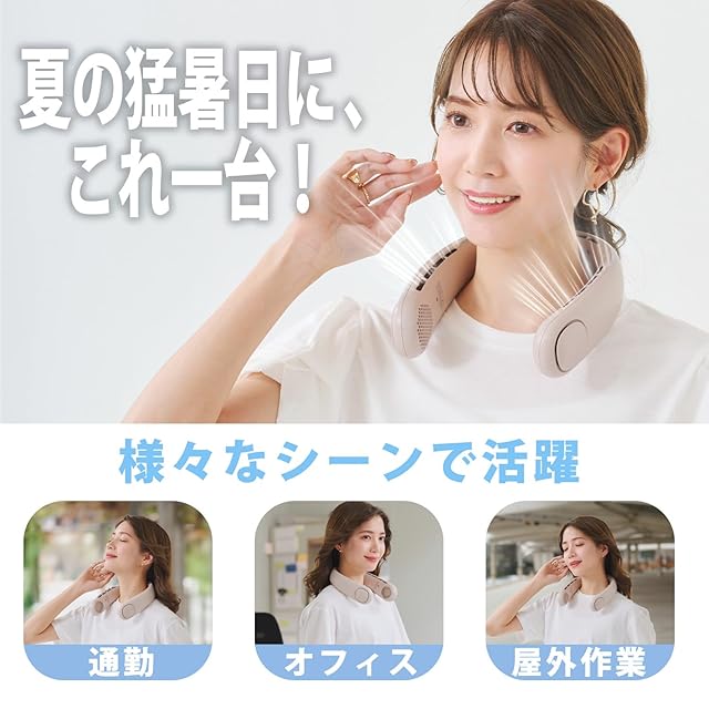 【大風量で全身クールダウン|メイク崩れも防ぐ】 両手が自由になるネックファンは、外出中や作業中でも涼しさをキープ。両側からパワフルな風を送り出し、顔まわりから首元までしっかり冷却。汗によるメイク崩れを防ぎたい女性にもおすすめです。風の広がり方にもこだわった設計で、真夏の暑さ対策に頼れる存在。ポータブル扇風機として、快適さと実用性を兼ね備えています。🚚 車の運転や配送作業、アウトドアや現場仕事でも活躍する、頼れるハンズフリーファンです。