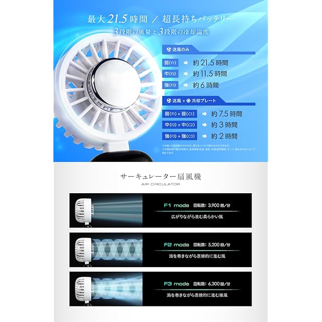 ✅【4400mAh大容量バッテリー/LEDディスプレイ】4400mAhの大容量バッテリーを内蔵で長時間稼働します。 LEDディスプレイのため、モードやバッテリー残量がひと目でわかります。 【動作時間】[送風のみ]弱(F1)3900回/分→約21.5時間、中(F2)5200回/分→約11.5時間、強(F3)6300回/分→約6時 [送風+冷却プレート](F1)+(C1)→約7.5時間、(F2)+(C2)→約3時間、(F3)+(C3)→約2時間 ※送風+冷却の組み合わせは、お好みのレベルで組み合わせ可能。冷却モードのみの使用はできません。 ※充電時間や動作時間は、充電環境や本製品の使用頻度、モード、組み合わせによって異なります。