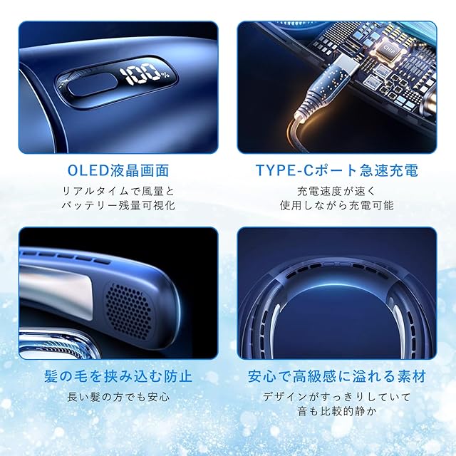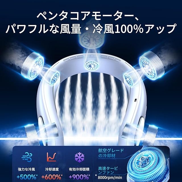 【360°送風・体感マイナス10℃の清涼感】104枚の高速タービンのブレードを採用し、涼しい風が首を効率よく冷やすことにより、夏の暑さを快適に過ごす体感マイナス10℃の清涼感を満喫。より広範囲冷却し、冷風100%アップ。ボタンを押すだけで、自由に3段階の風量(自然の風・爽快風・強風)調節を実現!蒸し暑くて我慢ができない真夏に、家事、アウトドア、熱中症、マスクの汗蒸れ、化粧崩れなど様々な悩みを解消します。全身だけではなく、心までも涼しさを楽しめます。
