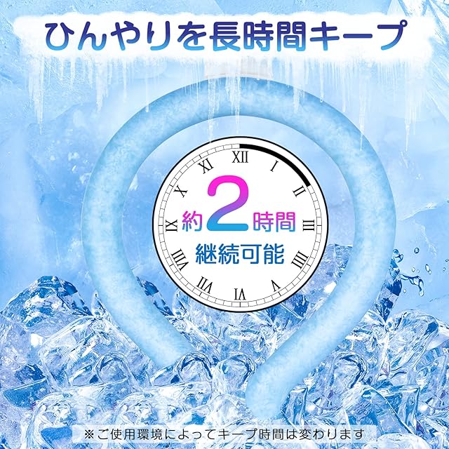 【ひんやりを長時間キープ】アイスネックリングは35℃の環境で最大2時間ほど冷却効果を維持できます。市販の凍結温度の低いクールリングより長くご利用いただけます。