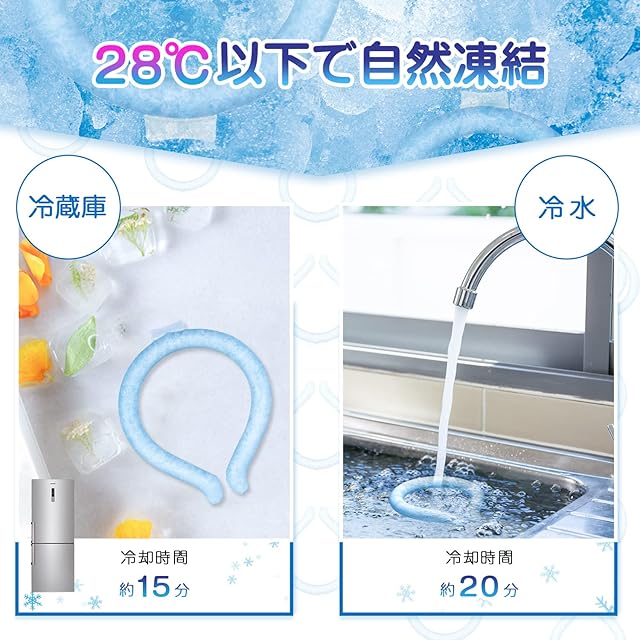 【15分で凍結】クールリングは28℃以下で自然凍結します。冷蔵庫に入れて冷やすと15分で凍結します。冷水の中では20分凍結します。固まるまでの時間が短く、便利にお使いいただけます。