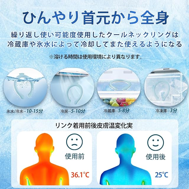 暑い真夏の季節でもリングはひんやりキープ!28度以下の空間で凍る不思議な氷「PCM素材」で作られた首元用のネッククーラー。 心地良い温度で首の頸動脈を効率的に冷やすので熱中症対策にもオススメ!氷のように冷えすぎないので低温障害の心配もなくお肌にもやさしい♪一度溶けてもエアコンの効いた涼しい空間などに置いておくだけでも再び凍って繰り返し使える!冷凍庫に入れたり水道水に浸けることでさらにスピーディに凍るので急なお出かけにも対応します。 首元にフィットして落ちにくいデザイン。スポーツでアクティブに動く方や屋外で作業をする方、通勤・通学時、釣りをする方、家事をする方、ホットフラッシュが気になる方、クーラーのない空間での活動、お風呂上がりや気分転換など様々なシーンでお使いいただけます。