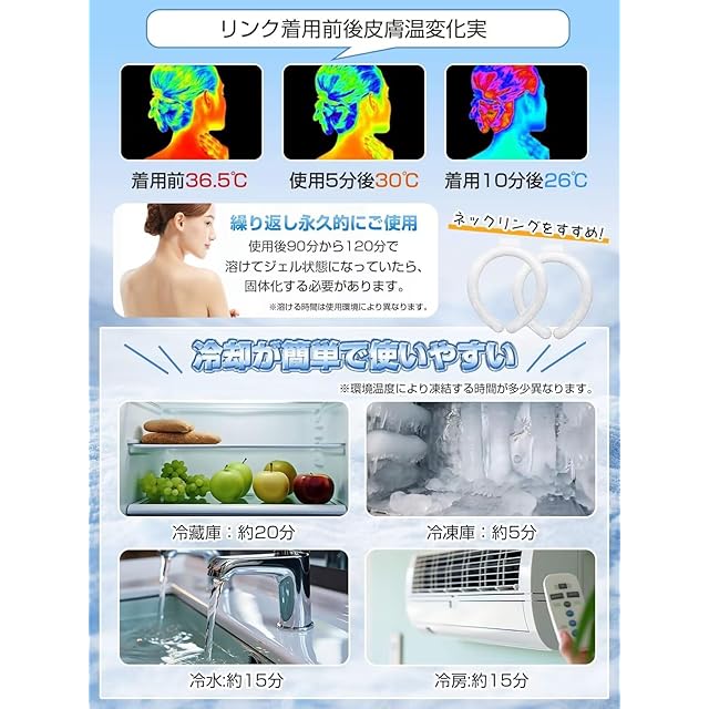 【使い方法簡単&繰り返し使用】:この首ひんやりグッズは首にかけるだけ使えます。ひんやりグッズは凍った状態なのでそのまま使えますが、ジェルの場合は冷蔵庫や氷水に入れて固める必要があります。凍結時間は特定の温度環境に関係しており、一定ではありません。この冷却チューブは28℃以上になると液体化・28℃以下になると個体へ変化・冷やせば繰り返し何度でも使用可能です。