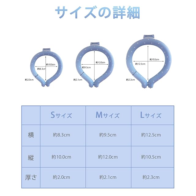 【商品仕様】 <br> 【サイズ】<br> 大人用サイズ<br> 縦:約13.0CM <br> 横:約12.0CM <br> 首周り:約39.0CM <br> 重量:135g±10g 太さ:20mm±5mm <br> <br> 【女性/子供用サイズ】 <br> 縦:約12.0CM <br> 横:約10.0CM <br> 首周り:約33.5CM <br> 重量:125g±10g <br> 太さ:20mm±5mm <br> 素材TPU、PCM(Phase Change Material) <br> 原産国CHINA 必ずお読んでください <br> ※冷たさの感じ方には個人差がございます。 <br> ※本製品は保冷剤のように使用することはできません。 <br> ※凍り方や個体差によって色の出方が異なります。 <br> ※凍った時に本体の一部がへこみますが、製品仕様となり使用には問題ございません。 <br> <br> ・特徴暑い真夏の季節でもリングはひんやりキープ! <br> ・28度以下の空間で凍る不思議な氷「PCM素材」で作られた首元用のネッククーラー。 <br> ・心地良い温度で首の頸動脈を効率的に冷やすので熱中症対策にもオススメ!<br> ・氷のように冷えすぎないので低温障害の心配もなくお肌にもやさしい♪ <br> ・一度溶けてもエアコンの効いた涼しい空間などに置いておくだけでも再び凍って繰り返し使える! <br> ・冷凍庫に入れたり水道水に浸けることでさらにスピーディに凍るので急なお出かけにも対応します。 <br> ・首元にフィットして落ちにくいデザイン。<br> ・スポーツでアクティブに動く方や屋外で作業をする方、通勤・通学時、釣りをする方、家事をする方、ホットフラッシュが気になる方、クーラーのない空間での活動、お風呂上がりや気分転換など様々なシーンでお使いいただけます。 <br> <br> <br> ▼関連キーワード クールリング 28度 クールバンド アイスバンド アイスリング スポーツ プレゼント 父の日ギフト 誕生日プレゼント 結婚祝い 敬老の日 母の日 父の日 ギフト ネッククーラー ママ パパ 子供 ペット おそろい ネックリング ネックバンド ひんやり 熱中症対策 遠足 運動会 公園 散歩 家事 水洗いOK 28℃以下で自然凍結 結露しない COSMOS認証 TPU PCM スポーツ 釣り アウトドア レジャー 海 海水浴 UV ランニング 冷却チューブ 子供用 女の子 男の子 首 冷却 暑さ対策 冷たい