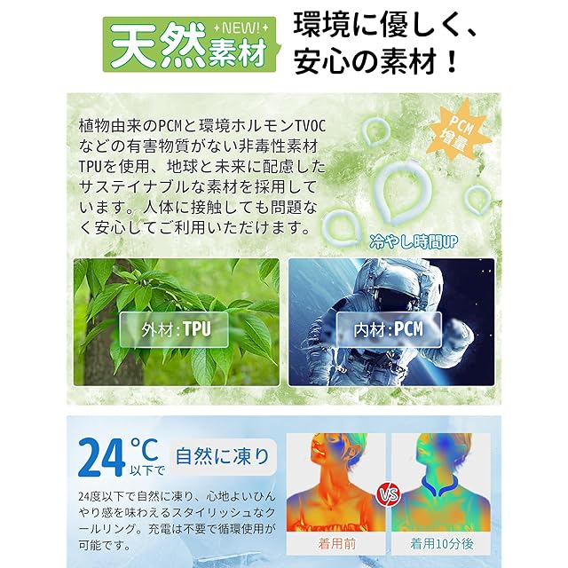 【環境に優しく、安心の素材!】植物由来のPCM(Phase Change Material)と無害なTPU(Thermoplastic Polyurethane)を使用し、地球と未来に配慮したサステイナブルな素材を採用したネックリングをご紹介します。人体に接触しても問題なく安心してご利用いただけます。