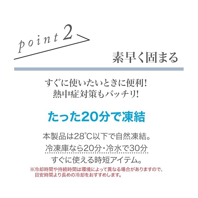 28℃以下で自然凍結。保冷剤や氷とは異なり、急激に冷やすものではなく人体に優しい、心地よい温度をキープ。