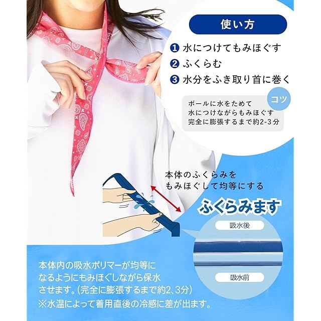 【使い方カンタン♪】 ①水を含ませる 本体の吸水ポリマーが均等になるようにもみほぐしながら吸水させます ボウルに水をためて本体を浸すと簡単です (完全に膨張するまで2、3分) ②表面を拭き首に巻く タオルなどで表面の余分な水を拭きとって首に巻くだけ! ③くり返し使えます 手洗い可能でいつでも清潔! 長時間乾燥させると吸水前の状態に戻ります