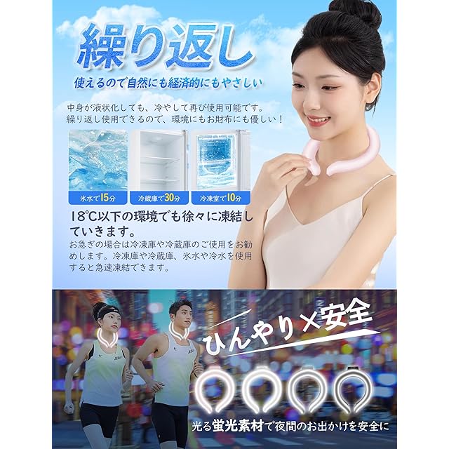 【18℃で凍結】冷蔵庫・冷凍庫、または18度以下の冷水・氷水に晒すことで再度凍結し、ひんやり感が復活します。軽量で長時間使用しても疲れにくいです!高い防水性を持つ素材を使用しているため、湿気を吸収しても表面はサラサラです。結露しないので、服や首元が濡れることはありません。