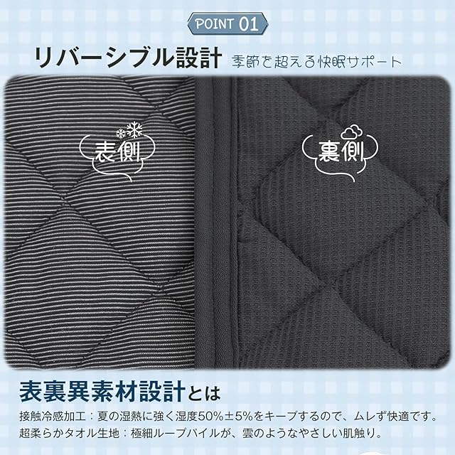 【表裏異素材リバーシブル設計:季節を超える快眠サポート】①表側:接触冷感加工。相対湿度50%±11%をキープ・夏の暑さや湿気に有効対応・梅雨時期の寝苦しさを解消!②裏側:ふわふわ・さらっとタオル生地。極細ル-プパイルが、まるで雲に包まれるような柔らかな接触感を提供します。