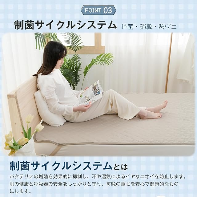 【制菌サイクルシステム:抗菌・消臭・防ダニ】バクテリアの増殖を効果的に抑制し、汗や湿気によるイヤなニオイを防止します。また、ダニの繁殖を防ぎ、肌の健康と呼吸器の安全をしっかりと守り、毎晩の睡眠を安心で健康的なものにします。
