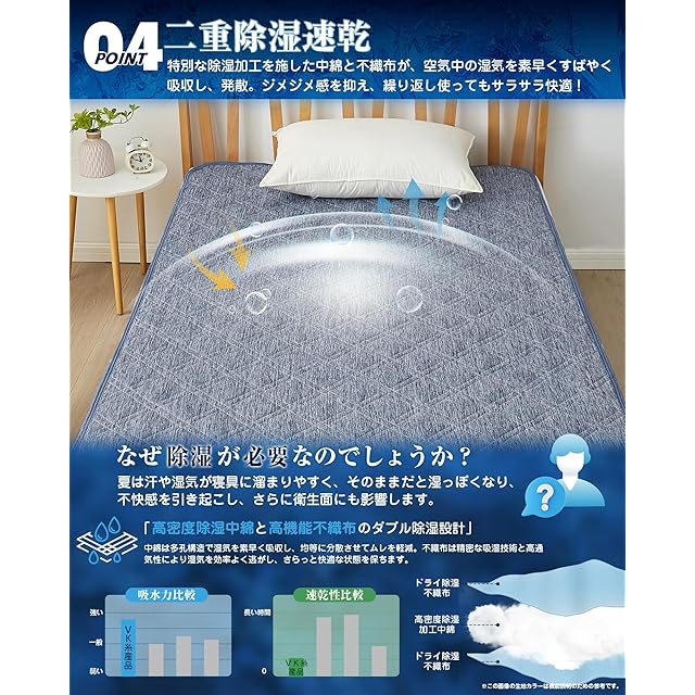 【二重除湿速乾】夏の寝苦しさは、温度だけでなく、湿気も夏の寝苦しさの要因となる。特別な除湿加工を施した中綿と不織布が、空気中の湿気を素早く吸収し、発散する。湿度を50±5%に近づけることでじめじめ感を解消、繰り返し使ってもサラサラ快適!