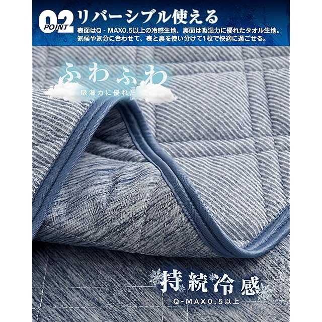 【リバーシブル】表面は業界最高レベルの冷たさQ-MAX0.5以上の接触冷感生地で、触れた瞬間ヒンヤリ!裏面はやさしい肌さわりタオル地。気候や気分に合わせて、表と裏を使い分けて1枚で快適に過ごせる!ポリエチレンの白糸と、カラーに染めたナイロンの2色の糸を混ぜ織りにすることで、涼しげな霜降りデザインに仕上げました。