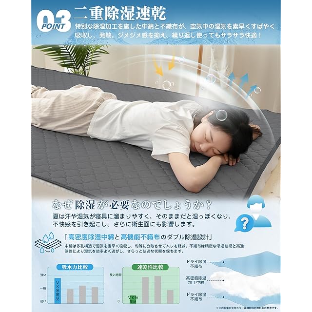 【二重除湿速乾】夏の寝苦しさは、温度だけでなく、湿気も夏の寝苦しさの要因となる。特別な除湿加工を施した中綿と不織布が、空気中の湿気を素早く吸収し、発散する。湿度を50±5%に近づけることでじめじめ感を解消、繰り返し使ってもサラサラ快適!