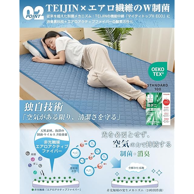 【TEIJIN×エアロ繊維のW制菌】 湿気や汗でジメジメする夏は、菌が繁殖しやすい季節です。中わたにテイジンの機能繊維「マイティトップII ECO」と、エアロアクティブファイバーの酸素活性化の組み合わせで、空気がある限り、24時間持続的に制菌消臭作用を発揮する。低ホルムアルデヒドなのでお子様にも安心。洗濯しても抗菌防臭・防ダニ効果は持続します。