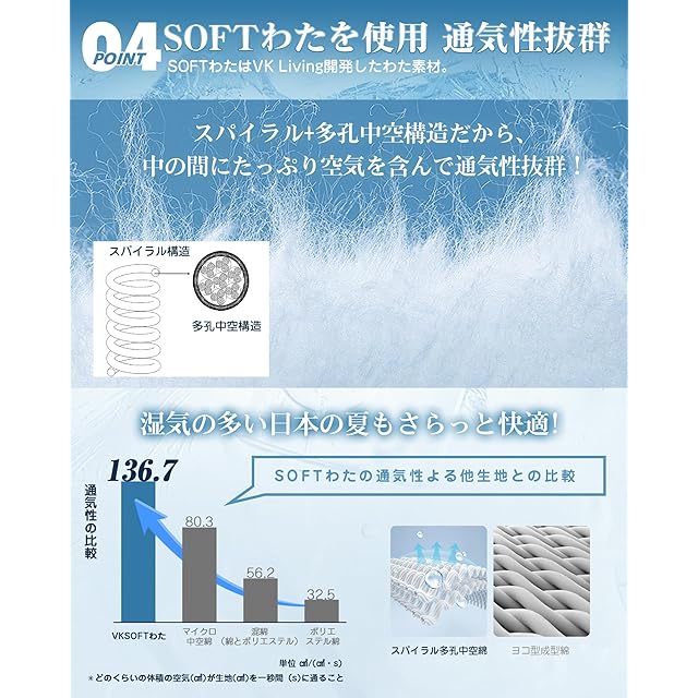 【超速乾スパイラルわた】VK Living独自開発の「3Dスパイラル速乾構造」スパイラル+多孔中空構造だから、中の間にたっぷり空気を含んで、通常の中空綿より1.5倍の通気性、夜中のベタつきとはもうサヨナラ!